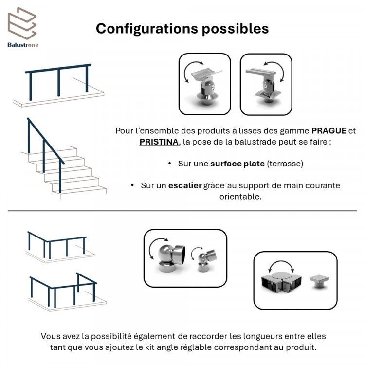 Installer la balustrade Pristina 5 lisses est un jeu d'enfant grâce à son kit prêt à poser. Fixez les platines en applique ou à sceller au sol avec la visserie adaptée à votre support, insérez les montants percés en usine, clippez les 5 lisses horizontales et la main courante, puis ajoutez les bouchons. Comptez quelques heures pour 3m linéaires. Polyvalente, elle s'adapte aux escaliers en pose latérale ou terrasses en applique. Les retours clients soulignent sa facilité, même pour les novices, avec une livraison rapide en 5-10 jours ouvrés. Pour des cas spécifiques comme un escalier incliné, contactez le fabricant pour conseils personnalisés.