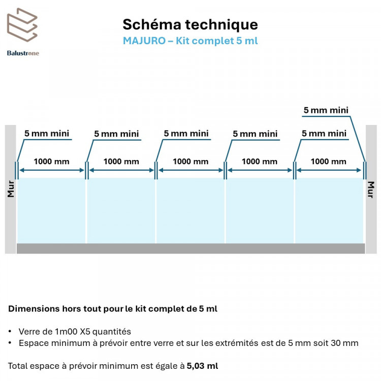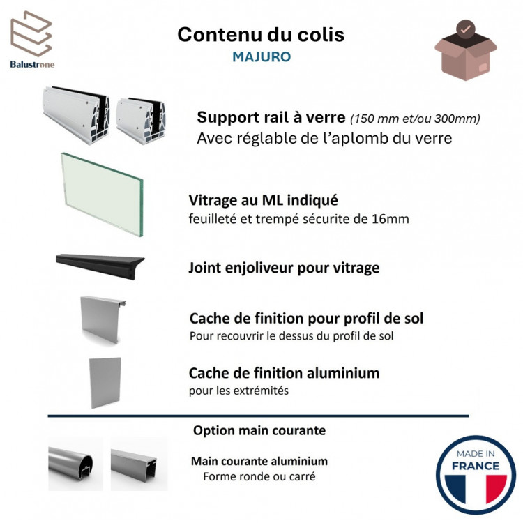 Description du produitLe garde-corps verre sur rail au sol Majuro est une solution moderne pour protéger vos espaces extérieurs et intérieurs. Son remplissage vitré en verre feuilleté et trempé garantit une sécurité maximale, conforme à la norme...