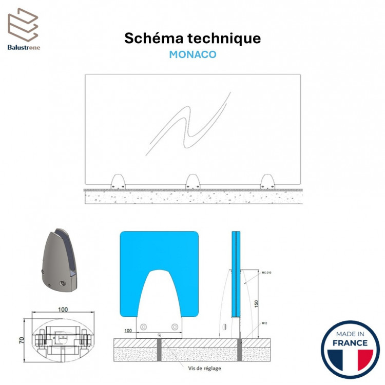 Le garde-corps Monaco est un kit standard de 3 mètres composé de trois panneaux de vitrage sécurit feuilleté et trempé de 17,12 mm (88/3), fixés par six pinces au sol en aluminium. Livré prêt à poser avec scellement chimique, tiges filetées et accessoires, il mesure 3,02 m hors tout et s'adapte à toute hauteur grâce à sa conformité NF. Sa structure aluminium labellisée Qualicoat offre résistance aux intempéries pour un usage intérieur ou extérieur durable et esthétique.