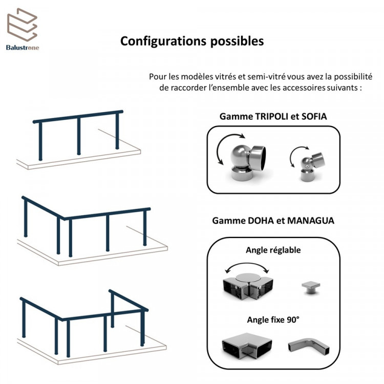 Optez pour des spécialistes comme Balustrone.fr pour le Tripoli sur mesure, fabriqué en France avec devis en 24h. Personnalisez verre (transparent, bronze, opale), aluminium (anthracite, chêne) et pose. Livraison rapide en kit prêt à poser, garantie 5 ans incluse. Ces pros du bâtiment depuis 30 ans offrent qualité NF, adaptant à balcons, terrasses ou mezzanines pour un design contemporain et sécurisé à prix attractifs.