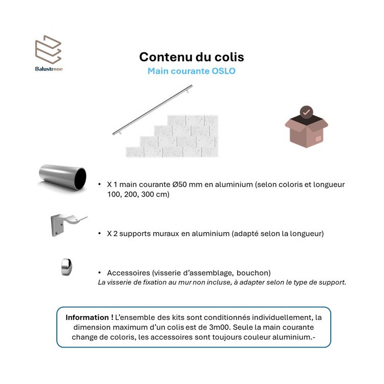 • Type de pose : à visser en applique au mur en adaptant la visserie selon le type de matériau sur lequel sera fixée la main courante