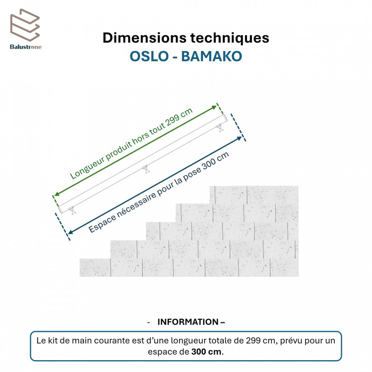 • Type de pose : à visser en applique au mur en adaptant la visserie selon le type de matériau sur lequel sera fixée la main courante